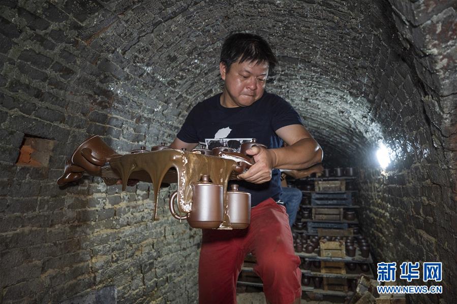 5月26日,在广西钦州市贵台镇那逻村仿宋朝龙窑第117窑开窑现场,施宝业在搬运烧化的坭兴陶制品。 广西钦州市非物质文化遗产传承人施宝业2013年投资300多万元,在钦州市贵台镇那逻村仿制了一座窑体长22米、宽约2米、高1.8米的宋朝龙窑。龙窑是指古代用柴草、松枝烧制陶瓷的土窑,因其形似一条长龙,故名龙窑。贵台龙窑采用松树枝进行烧制,截至2019年5月26日的第117窑,已经烧制了近百万件坭兴陶制品。 新华社记者 才扬 摄