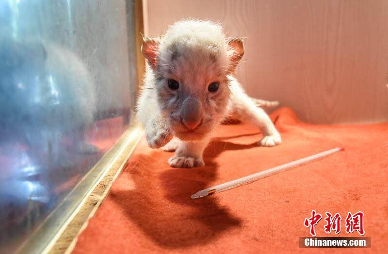 一个月前,杭州野生动物世界雪虎“彤彤”顺利产下两只虎宝,其中“哥哥”是一只通体金黄的金虎,“妹妹”是一只浑身雪白的雪虎。图为双胞胎妹妹雪虎。图为金虎雪虎龙凤胎。 (杭州野生动物世界供图)