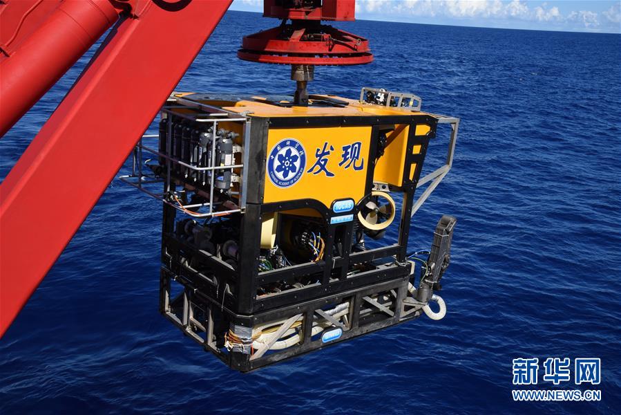 “发现”号遥控无人潜水器准备入水(5月27日摄)。 5月27日,中国远洋综合科考船“科学”号正式展开对马里亚纳海沟南侧系列海山的精细调查,主要利用“发现”号遥控无人潜水器等设备探秘生物多样性和生态系统。 新华社记者 张旭东 摄
