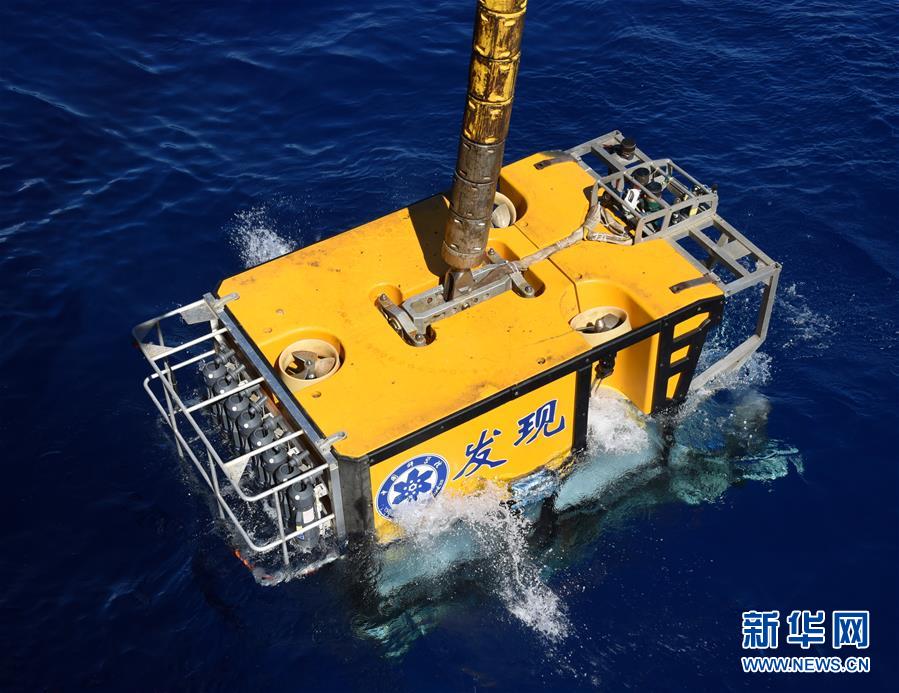 “发现”号遥控无人潜水器入水(5月27日摄)。 5月27日,中国远洋综合科考船“科学”号正式展开对马里亚纳海沟南侧系列海山的精细调查,主要利用“发现”号遥控无人潜水器等设备探秘生物多样性和生态系统。 新华社记者 张旭东 摄