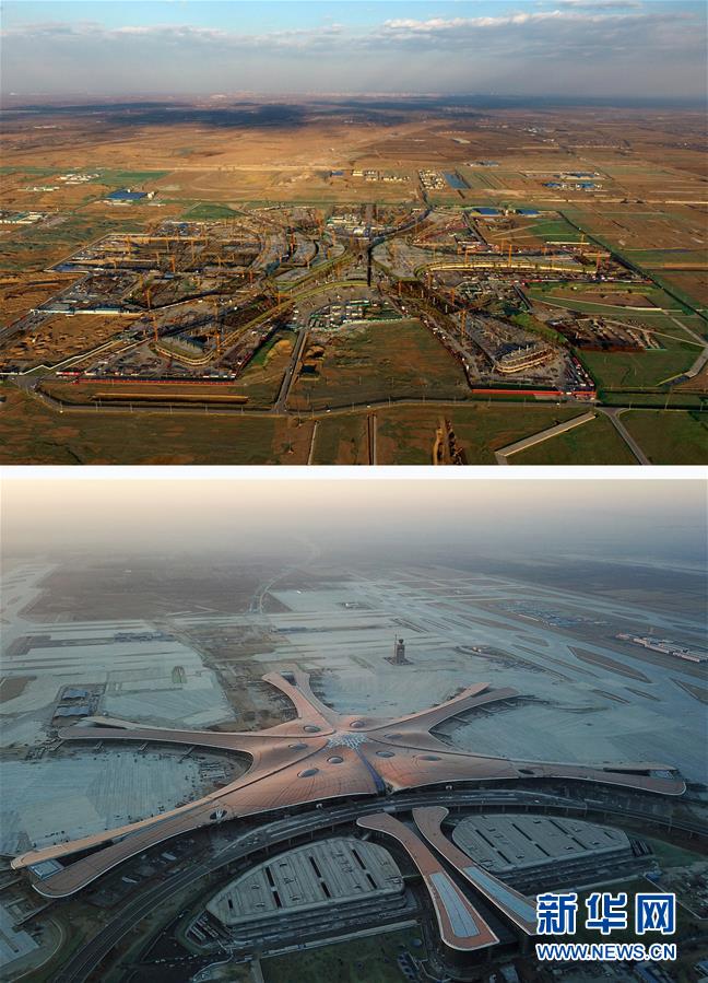 拼版照片:上图为2017年2月25日拍摄的北京新机场建设工地(新华社记者罗晓光摄);下图为2018年12月29日拍摄的主航站楼外立面装修工程全面完成的北京大兴国际机场(新华社记者鞠焕宗摄)。 新华社发