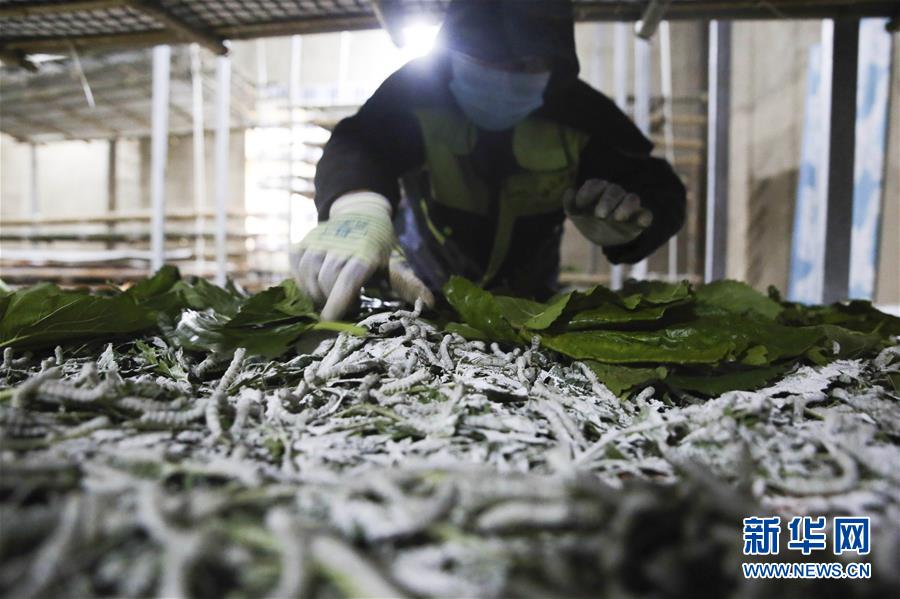 5月27日,在毕节市大方县东关乡合中村,村民给“蚕宝宝”添加桑叶。 今年41岁的李先义是贵州省毕节市大方县东关乡合中村村民。2017年,在外务工的李先义决定回乡创业。经过多方考察取经,李先义决定因地制宜,发展种桑养蚕产业。如今,他种植的桑苗面积达1500余亩,建有蚕房约3800平方米。此外,李先义还通过种桑养蚕基地吸纳当地村民就业,带动村民增产增收。 新华社发(罗大富 摄)