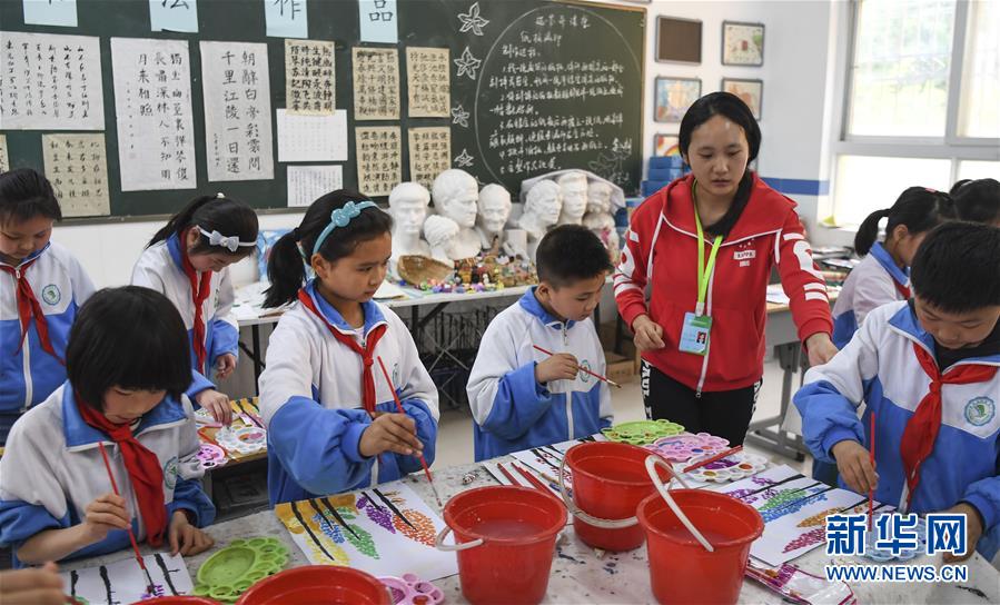 5月27日,略阳县何家岩小学美术教师高婕(前右二)在辅导留守儿童绘画。 近年来,地处秦岭腹地的陕西省略阳县把教育关爱留守儿童和贫困家庭儿童作为打赢脱贫攻坚战的基础工程来抓,构建“物质上优先资助、生活上优先帮助、学习上优先辅导、活动中优先安排”关爱机制。全县建成留守儿童管护中心(心理咨询室)54个,安装150部亲情电话和视频聊天设备,落实“代理家长”722人,对留守儿童和贫困学生在思想上教育、在生活上帮助、在学业上辅导,保障孩子们快乐学习、健康成长。 新华社记者 陶明 摄