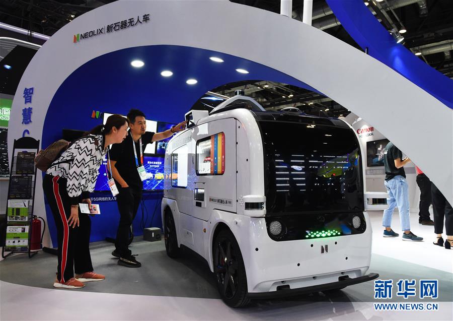 5月28日,观众在交易会主会场观看展出的自动驾驶无人车。 当日,2019年中国国际服务贸易交易会在北京开幕。 新华社发(任超 摄)