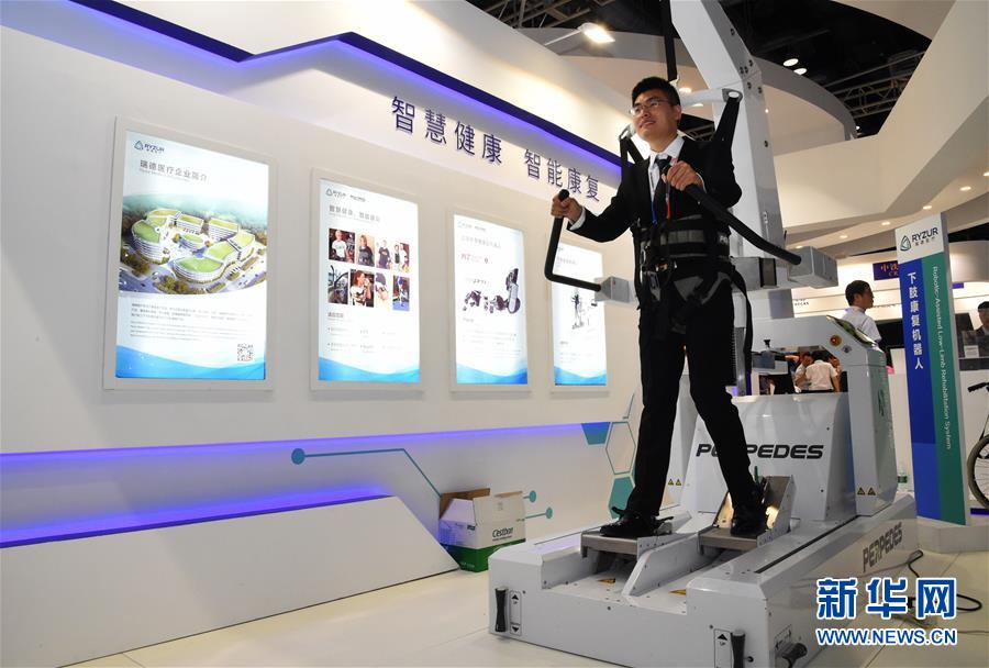 5月28日拍摄的在交易会主会场展出的下肢康复机器人。 当日,2019年中国国际服务贸易交易会在北京开幕。 新华社发(任超 摄)