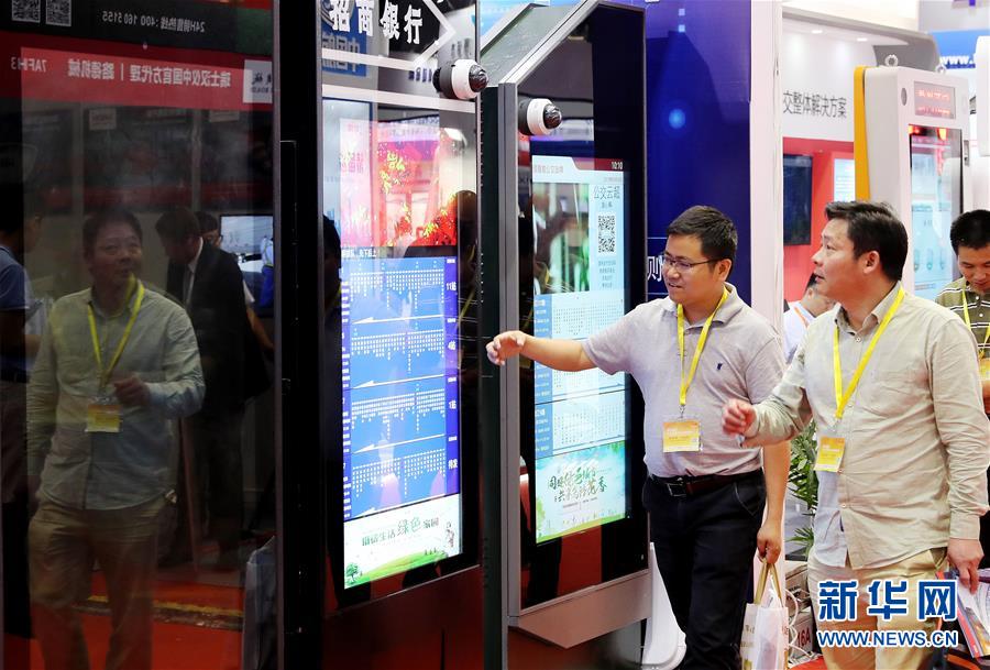 5月28日,参观者在观看智能公交站牌展品。新华社记者 方喆 摄