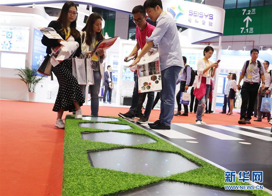 5月28日,参观者在观看一组用于人行道铺设、能在夜晚发光的太阳能智慧砖展品。新华社记者 方喆 摄