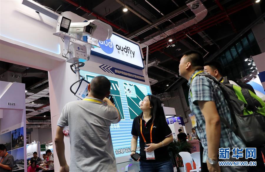 5月28日,参观者在观看违法鸣笛电子警察抓拍系统展品。新华社记者 方喆 摄