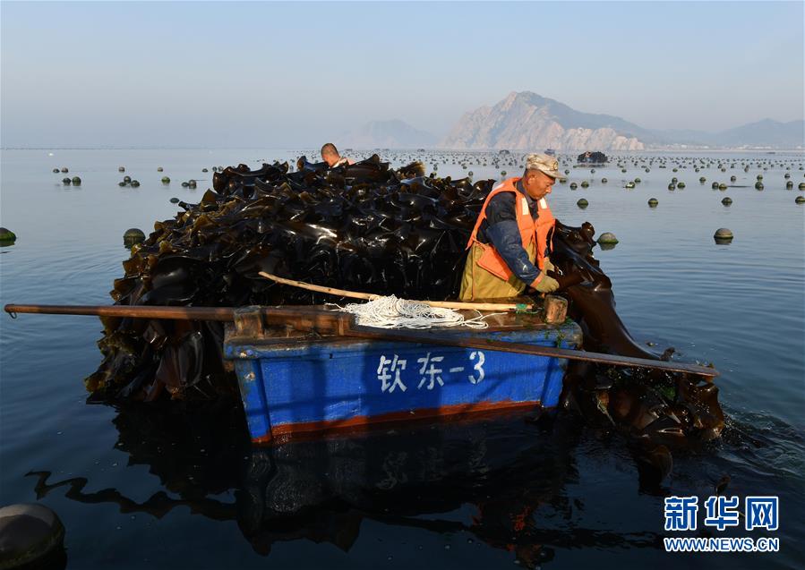 海岛居民们在养殖区收割海带(5月24日摄)。 新华社记者 朱峥 摄