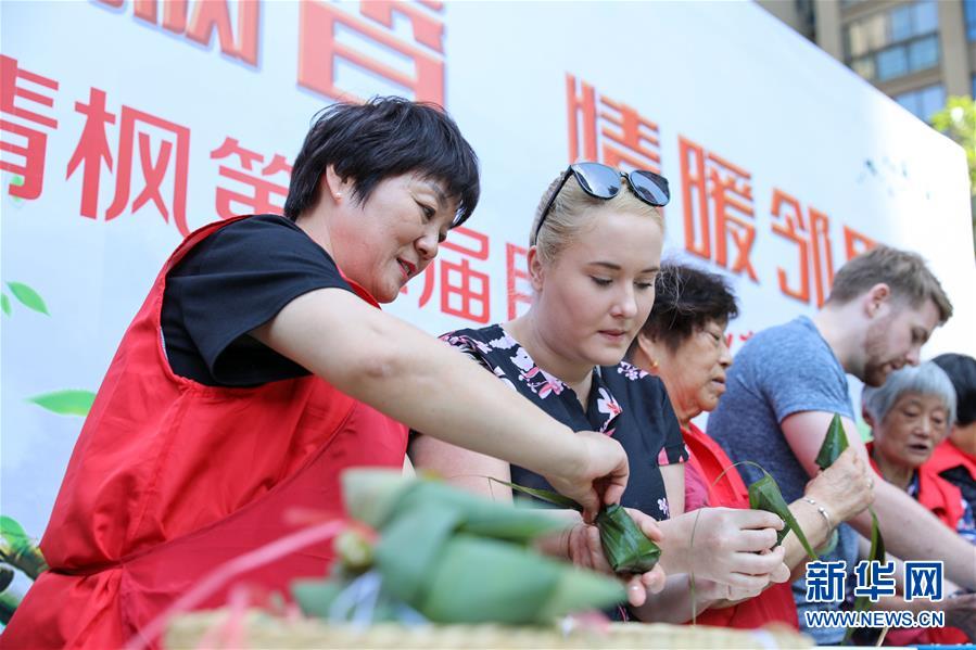 5月28日,外国友人在学包粽子。 当日,合肥市滨湖世纪社区开展“艾粽飘香 情暖邻里”端午民俗文化活动,邀请外国友人近距离体验中国端午民俗,感受中华传统文化的魅力。 新华社记者 曹力 摄