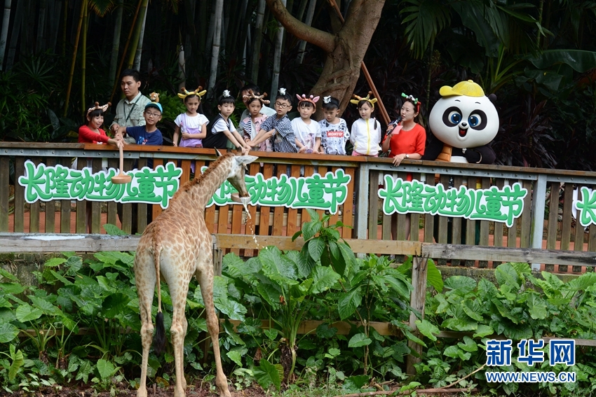 孩子们争相给长颈鹿喂奶,体验“长颈鹿妈妈”的艰辛。新华网发(许建梅摄)