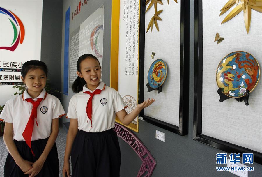 5月29日,北京海淀区民族小学的学生在介绍学生们制作的景泰蓝作品。 当日,由中国教育科学研究院和北京市教委联合主办的中小学培育和践行社会主义核心价值观研讨会在北京海淀区民族小学举行。会议回顾总结五年来中小学培育和践行社会主义核心价值观的历程,共同研讨新时期中小学培育和践行社会主义核心价值观工作。 新华社记者 刘莲芬 摄