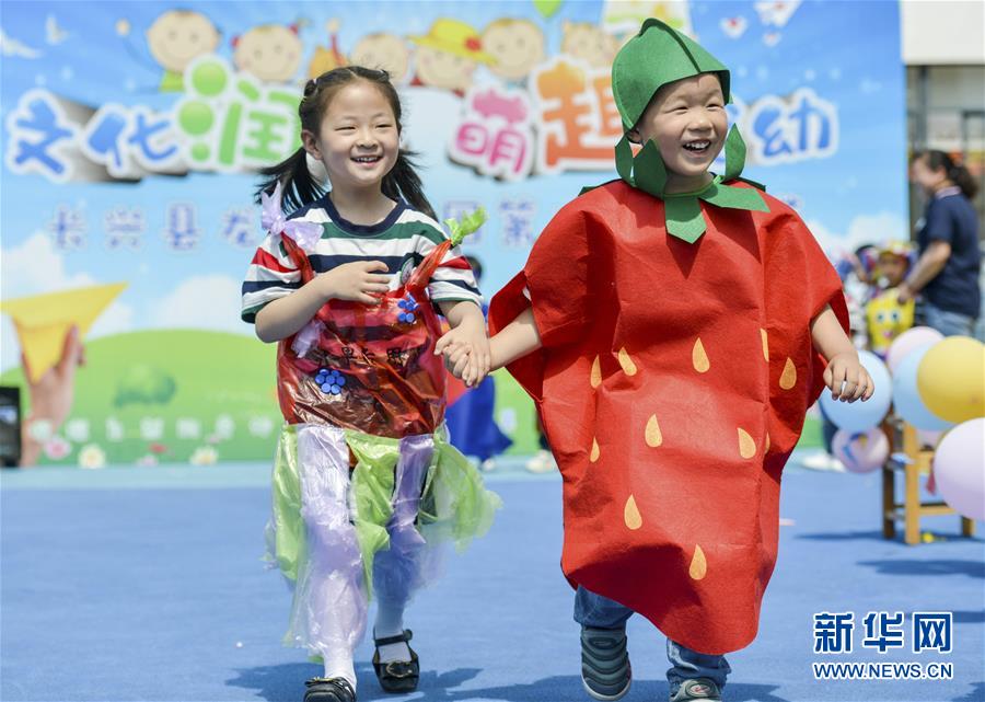 5月29日,在浙江省湖州市长兴县龙山幼儿园举行的迎“六一”主题活动中,孩子们在展示手工制作的服装。 新华社发(谭云俸 摄)