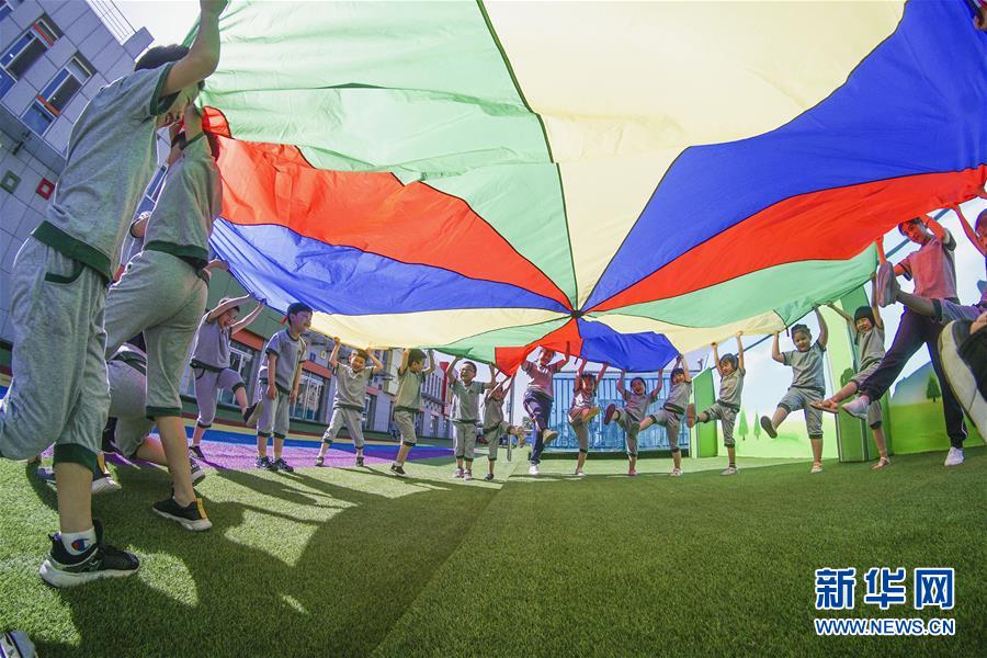 5月29日,河北遵化市阳光幼儿园的孩子们和老师一起玩彩虹伞。 新华社发(刘满仓 摄)