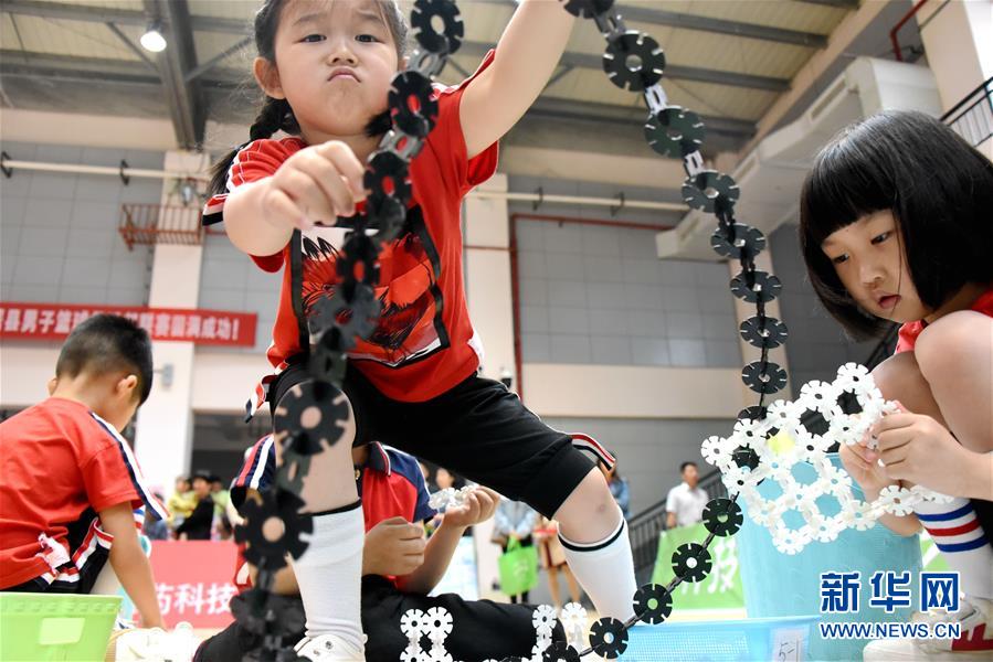 5月29日,浙江省台州市仙居县春晖幼儿园大班的小朋友正在聚精会神参与“未来家园”大型拼搭赛。 新华社发(王华斌 摄)