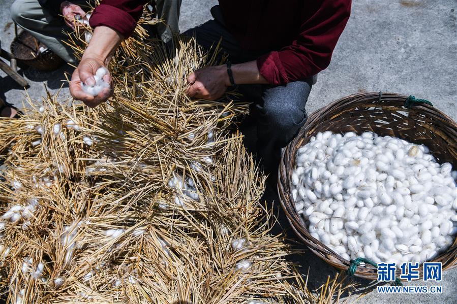 5月29日,潞村村民从稻草上采茧,当地许多村民仍然保留着养蚕的习俗。新华社记者 徐昱 摄