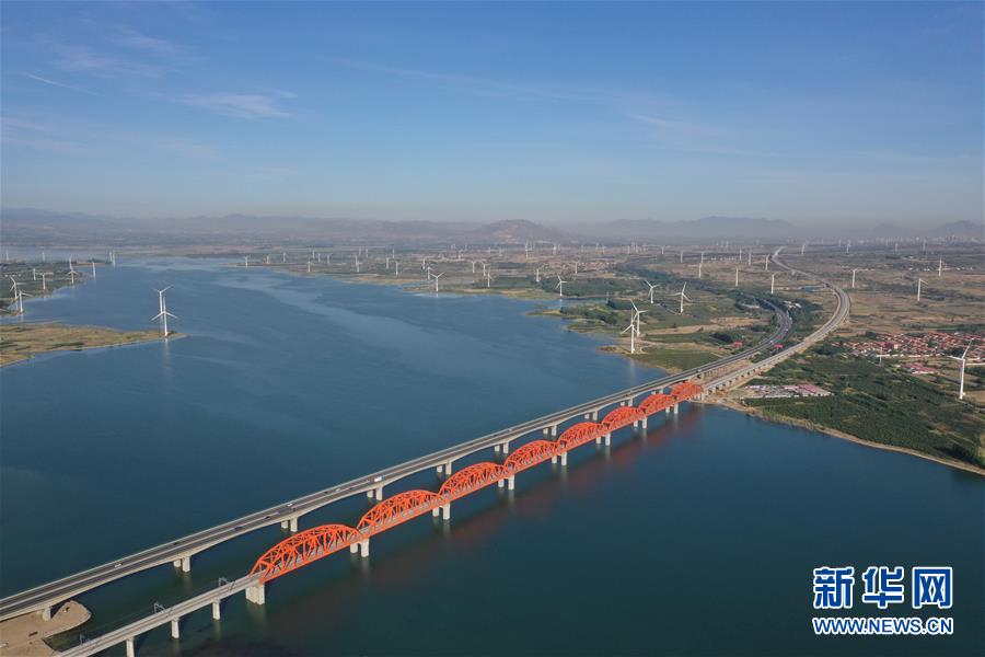 5月29日无人机拍摄的京张高铁官厅水库特大桥。 日前,京张高铁官厅水库特大桥铺轨工作完成,为京张高铁全线开通提供了保障。 新华社记者邢广利摄