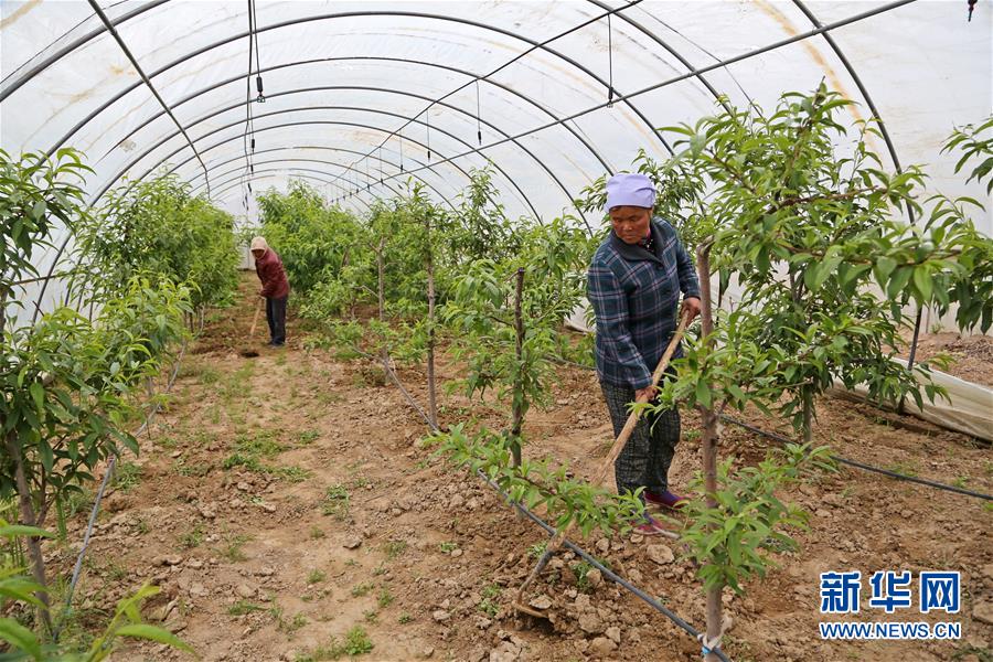 农户在西吉县平峰镇高赵村的拱棚内为桃树除草(5月29日摄)。 随着生态环境的改善,宁夏固原市西吉县试验发展林草产业助脱贫的新路径,通过实施“一棵树、一株苗、一枝花、一棵草”的“四个一”林草产业工程,按照多区域布局、多品种试验、突出主打品种的原则,鼓励引导合作社、家庭农场、企业和农户等积极参与,实现生产、加工、销售一体化,推动地方脱贫进程。 新华社记者 张晨岑 摄