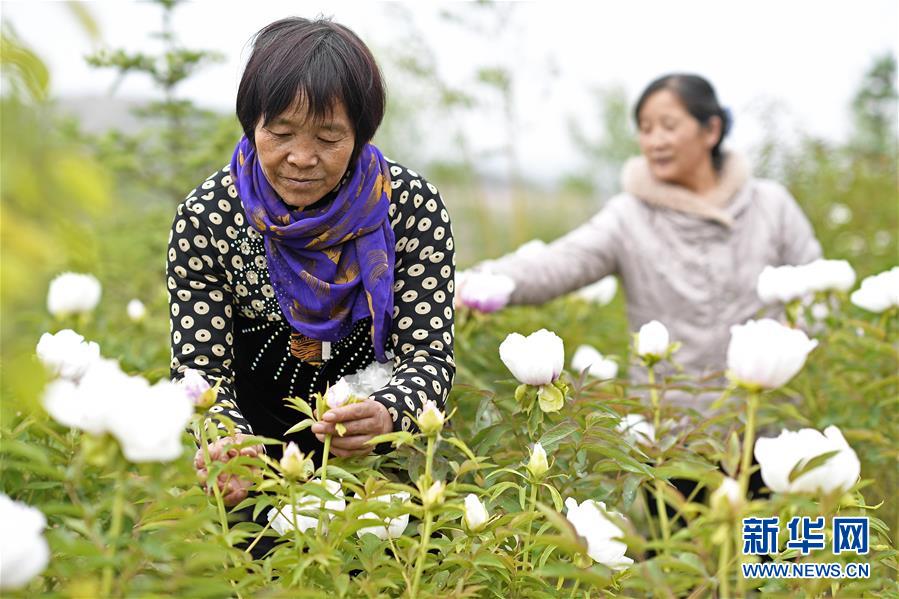农户在西吉县吉强镇龙王坝村打理牡丹花(5月29日摄)。 随着生态环境的改善,宁夏固原市西吉县试验发展林草产业助脱贫的新路径,通过实施“一棵树、一株苗、一枝花、一棵草”的“四个一”林草产业工程,按照多区域布局、多品种试验、突出主打品种的原则,鼓励引导合作社、家庭农场、企业和农户等积极参与,实现生产、加工、销售一体化,推动地方脱贫进程。 新华社记者 王鹏 摄