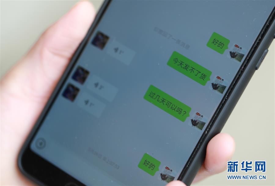 彭超与客户通过手机微信交谈鸡蛋销售情况(5月29日摄)。 新华社发(刘欣荣 摄)