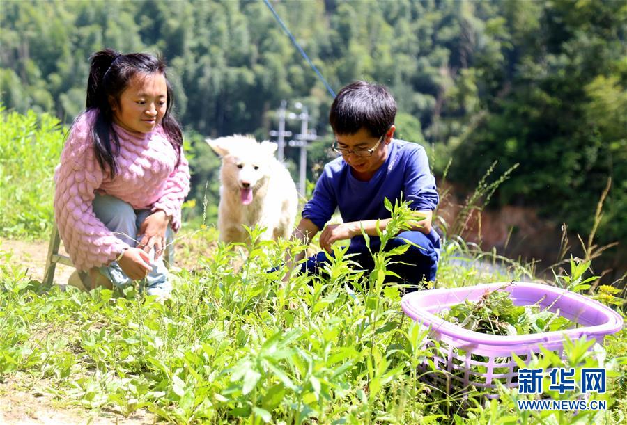 彭超(左)与丈夫陈飞采草药喂鸡预防鸡疾病(5月23日摄)。 新华社发(刘欣荣 摄)