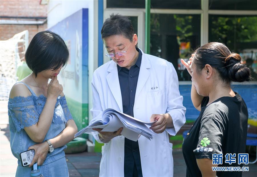 5月29日,在北京市通州区人工耳蜗培训学校,北大医院耳科专家刘玉和教授(中)在为接受耳蜗植入术后康复的听障儿童家长做咨询。 当日,以“爱久·久爱 让爱延续”为主题的庆“六一”活动在北京市通州区人工耳蜗培训学校举行。北大医院耳鼻喉科听力团队免费为孩子们提供声导抗、耳波发射等检查项目。 新华社发(蒲东峰 摄)