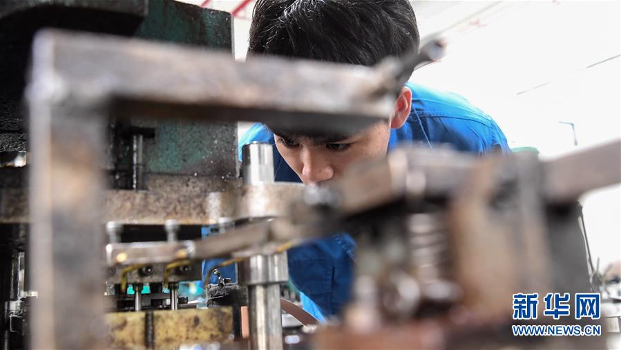 5月29日,在钦州市高新技术开发区一家企业的“扶贫车间”,来自钦南区易地扶贫搬迁安置点的青年在检修机械。 2017年起,广西钦州市钦南区通过“政府主导、企业响应”的方式,在钦州市高新技术开发区开办多个“扶贫车间”,吸纳来自钦南区易地扶贫搬迁安置点的贫困群众进厂工作。目前,已有近千名贫困群众成为企业生产的熟练工,昔日在贫困线上挣扎的山里人蜕变成为“朝九晚五”的“上班族”。 新华社记者 张爱林 摄
