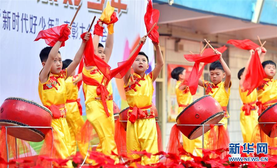 5月30日,河北石家庄市机场路小学的学生在“‘六一’文艺汇演暨新时代好少年表彰大会”上表演节目。 新华社发(张晓峰 摄)