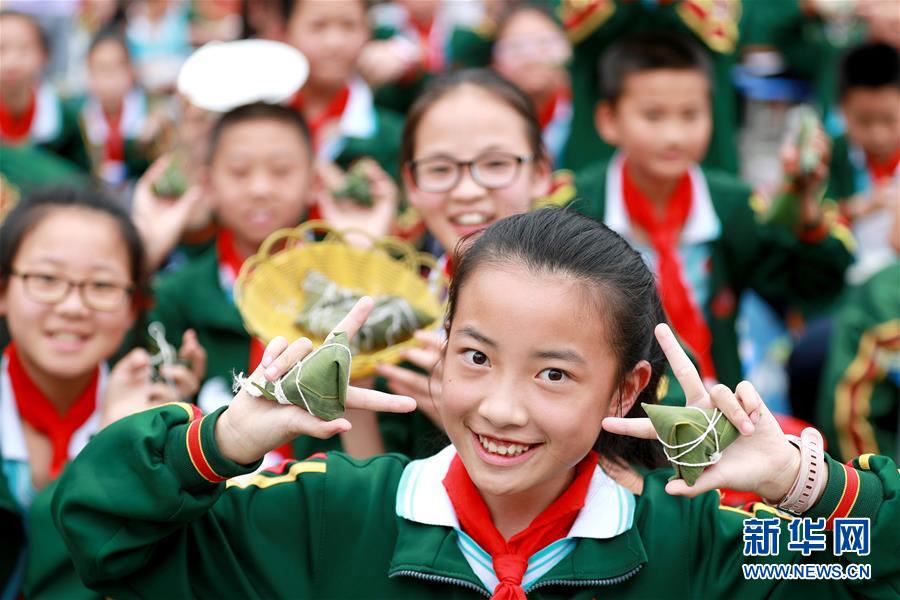 5月30日,在湖北省宜昌市秭归县一所希望小学,学生在展示自己包的粽子。