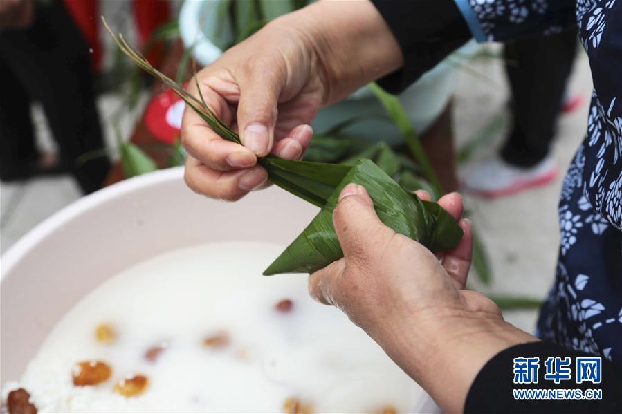 5月30日,在江苏省连云港市连云区连岛街道,居民在进行包粽子比赛。
