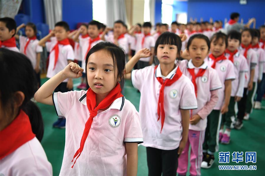 5月30日,少先队员在入队仪式上宣读入队誓词。 当日,安徽省合肥一六八玫瑰园学校举行少先队员入队仪式,小学生们在“六一”前夕戴上红领巾,光荣加入中国少年先锋队。 新华社记者 刘军喜 摄