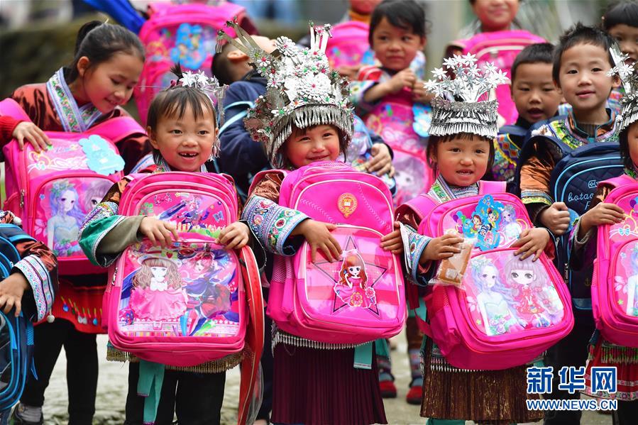 5月30日,融水苗族自治县杆洞乡黔桂乌英苗寨的孩子们领到了爱心书包。 当日,广西柳州市交警、消防等部门以及部分爱心企业志愿者来到融水苗族自治县杆洞乡黔桂乌英苗寨,为孩子们传授交通知识和消防技能,并送上“六一”节礼物,迎接儿童节的到来。 新华社记者 黄孝邦 摄