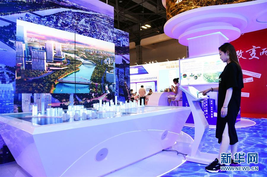 5月29日,观众在2019中国国际服务贸易交易会金融服务主题展上通过沙盘了解北京市通州商务区。