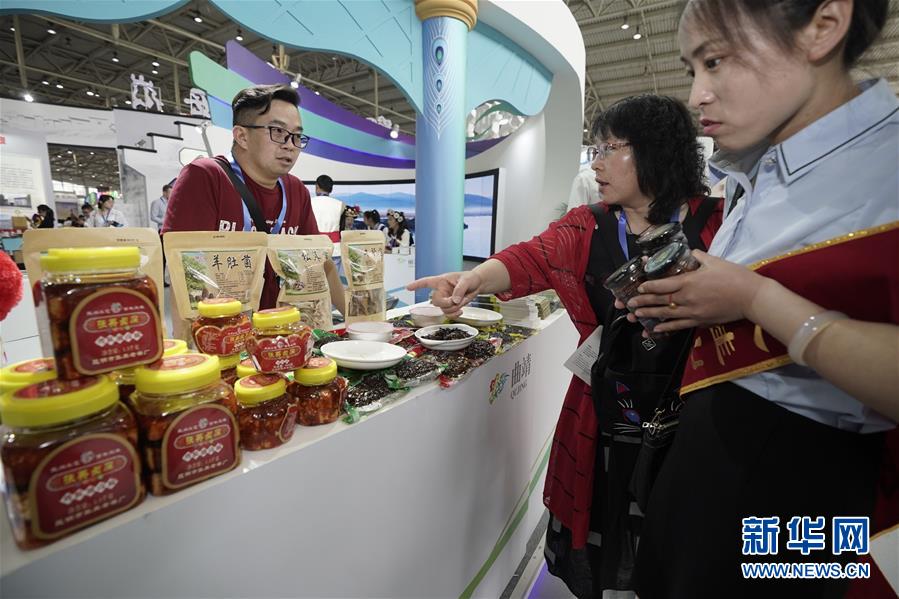 5月16日,工作人员(左)在北京举行的亚洲文化旅游展云南展台介绍当地特产。新华社记者 才扬 摄