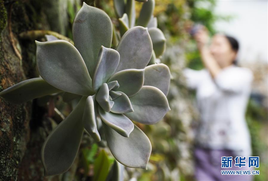 5月31日,游人在东坑镇深垟村长满多肉植物的石墙前拍摄。 浙江省丽水市景宁畲族自治县东坑镇深垟村有“石寨”的美誉,当地传统民居多为石头堆垒而成。近年来,当地推广多肉植物,在石墙和民居庭院大面积种植,扮靓乡村景色的同时,也增加了村民收入。 新华社发(李肃人 摄)