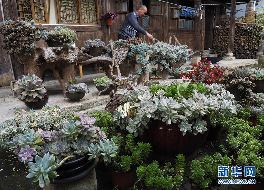5月31日,东坑镇深垟村村民在照料自家多肉植物。 浙江省丽水市景宁畲族自治县东坑镇深垟村有“石寨”的美誉,当地传统民居多为石头堆垒而成。近年来,当地推广多肉植物,在石墙和民居庭院大面积种植,扮靓乡村景色的同时,也增加了村民收入。 新华社发(李肃人 摄)
