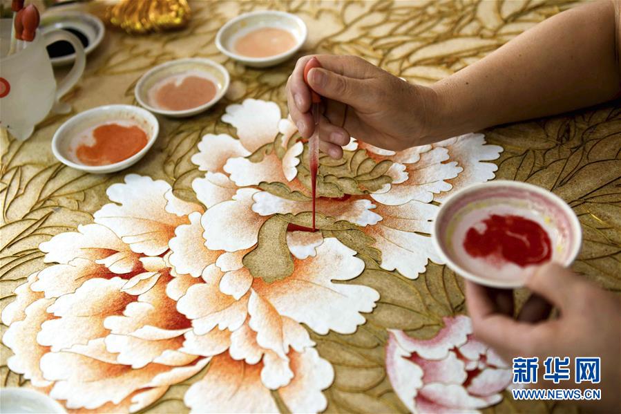 5月31日,在石家庄市裕华区,非遗传承人王玉萍在工作室进行金丝彩釉点蓝工序。 “金丝彩釉工艺”是河北省级非物质文化遗产项目,技法脱胎于景泰蓝制作工艺。主要工序有拓图、掐丝、点蓝、上光等。金丝彩釉艺人将金色的金属丝作为绘画的线条,把各种天然的矿物颜料研磨成的细粉作为颜料,在木板上创作成画作。一幅作品常常需要数月甚至数年的时间才能完成。 新华社发(陈其保 摄)