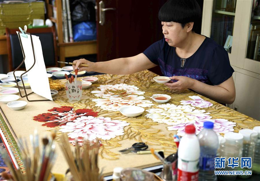 5月31日,在石家庄市裕华区,非遗传承人王玉萍在工作室创作金丝彩釉工艺作品。 “金丝彩釉工艺”是河北省级非物质文化遗产项目,技法脱胎于景泰蓝制作工艺。主要工序有拓图、掐丝、点蓝、上光等。金丝彩釉艺人将金色的金属丝作为绘画的线条,把各种天然的矿物颜料研磨成的细粉作为颜料,在木板上创作成画作。一幅作品常常需要数月甚至数年的时间才能完成。 新华社发(陈其保 摄)