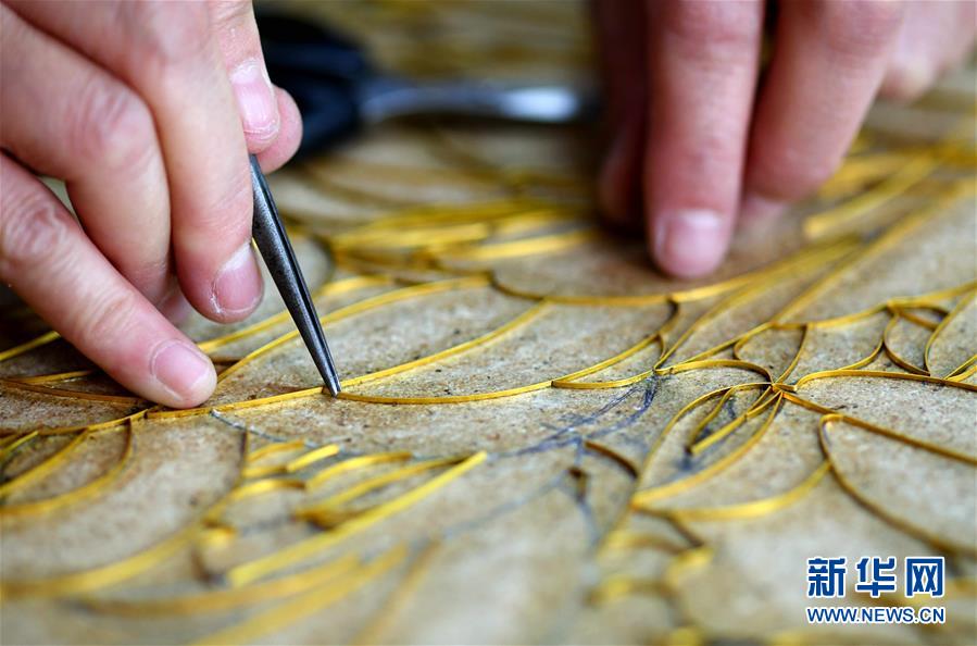 5月31日,在石家庄市裕华区,非遗传承人王玉萍在工作室进行金丝彩釉掐丝工序。掐丝是将金属丝做成线条粘到木板上。 “金丝彩釉工艺”是河北省级非物质文化遗产项目,技法脱胎于景泰蓝制作工艺。主要工序有拓图、掐丝、点蓝、上光等。金丝彩釉艺人将金色的金属丝作为绘画的线条,把各种天然的矿物颜料研磨成的细粉作为颜料,在木板上创作成画作。一幅作品常常需要数月甚至数年的时间才能完成。 新华社发(陈其保 摄)