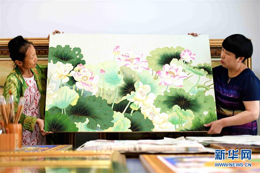 5月31日,在石家庄市裕华区,非遗传承人王玉萍(右)和学员在工作室展示金丝彩釉工艺作品。 “金丝彩釉工艺”是河北省级非物质文化遗产项目,技法脱胎于景泰蓝制作工艺。主要工序有拓图、掐丝、点蓝、上光等。金丝彩釉艺人将金色的金属丝作为绘画的线条,把各种天然的矿物颜料研磨成的细粉作为颜料,在木板上创作成画作。一幅作品常常需要数月甚至数年的时间才能完成。 新华社发(陈其保 摄)