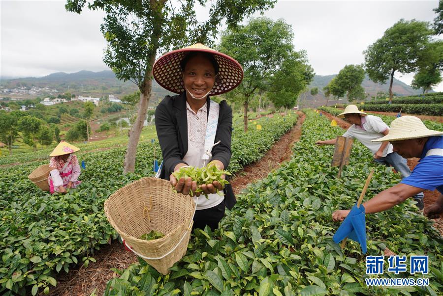 5月31日,在祖祥高山茶园有限公司有机茶园,茶农罗小唤(中)展示她采摘的有机茶叶。 新华社记者 秦晴 摄