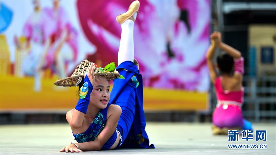 钦州市雨璇艺术中心的小学员在表演舞蹈《傣族小阿妹》(5月31日摄)。 5月31日晚,广西钦州市的少年儿童们欢聚北部湾广场,载歌载舞,庆祝“六一”国际儿童节。 新华社记者 张爱林 摄