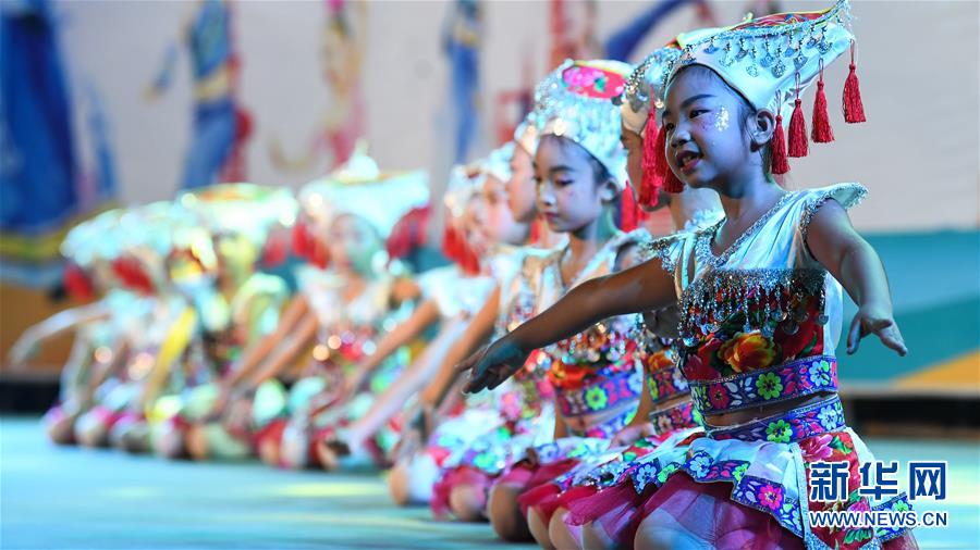 少儿们在表演群舞(5月31日摄)。 5月31日晚,广西钦州市的少年儿童们欢聚北部湾广场,载歌载舞,庆祝“六一”国际儿童节。 新华社记者 张爱林 摄