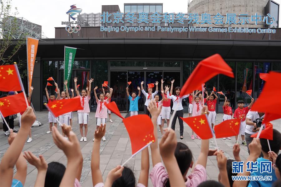6月1日,北京市石景山区电厂路小学的学生和老师在参观前唱《我和我的祖国》。新华社记者鞠焕宗摄