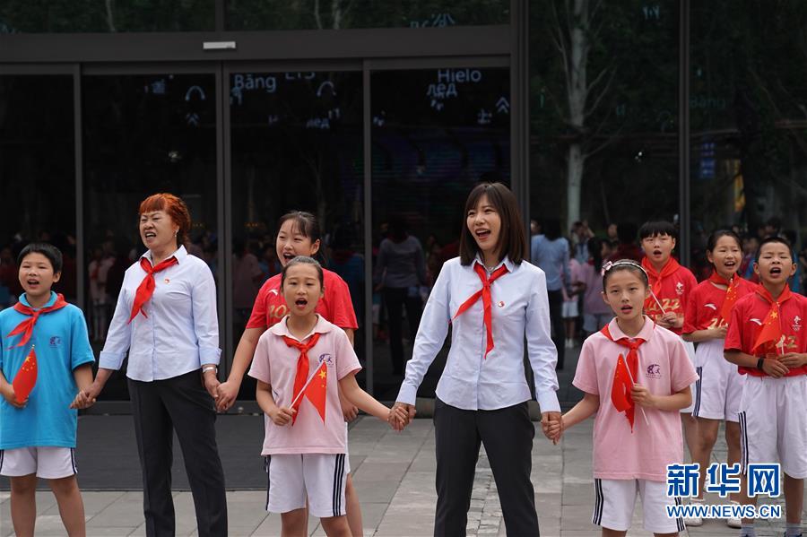 6月1日,北京市石景山区电厂路小学的学生和老师在参观前唱《我和我的祖国》。新华社记者鞠焕宗摄
