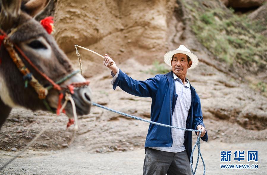 5月29日,尚可栋在黄河石林景区赶“驴的”。 68岁的尚可栋是甘肃省白银市景泰县中泉镇龙湾村村民,因为龙湾村毗邻著名的黄河石林景区,十多年来,通过给前来旅游的中外游客当“驴的”司机,尚可栋家的日子越过越红火。据他介绍,在旅游旺季,他每天能带4趟游客,收入可达300多元。 黄河石林风景区将黄河、石林、沙漠、戈壁、绿洲等多种自然资源巧妙组合在一起,山水相依,动静结合,气势磅礴。通过多年发展,已成为甘肃省地质遗迹自然保护区、国家4A级旅游景区,每年都会吸引大量中外游客前来观光旅游。 依靠得天独厚的旅游资,当地积极发展乡村旅游助推精准扶贫,村里不少村民通过赶“驴的”为游客服务,实现了旅游致富。据介绍,目前龙湾村共有“驴的”360辆, 2018年全村人均可支配收入达到13800元,其中旅游收入占比达到76%。 新华社记者 潘昱龙 摄