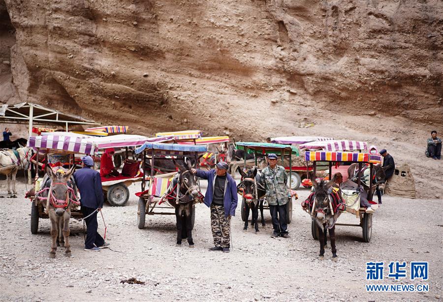 5月29日,“驴的”主人在黄河石林景区入口处等待生意。 68岁的尚可栋是甘肃省白银市景泰县中泉镇龙湾村村民,因为龙湾村毗邻著名的黄河石林景区,十多年来,通过给前来旅游的中外游客当“驴的”司机,尚可栋家的日子越过越红火。据他介绍,在旅游旺季,他每天能带4趟游客,收入可达300多元。 黄河石林风景区将黄河、石林、沙漠、戈壁、绿洲等多种自然资源巧妙组合在一起,山水相依,动静结合,气势磅礴。通过多年发展,已成为甘肃省地质遗迹自然保护区、国家4A级旅游景区,每年都会吸引大量中外游客前来观光旅游。 依靠得天独厚的旅游资,当地积极发展乡村旅游助推精准扶贫,村里不少村民通过赶“驴的”为游客服务,实现了旅游致富。据介绍,目前龙湾村共有“驴的”360辆, 2018年全村人均可支配收入达到13800元,其中旅游收入占比达到76%。 新华社记者 邵瑞 摄