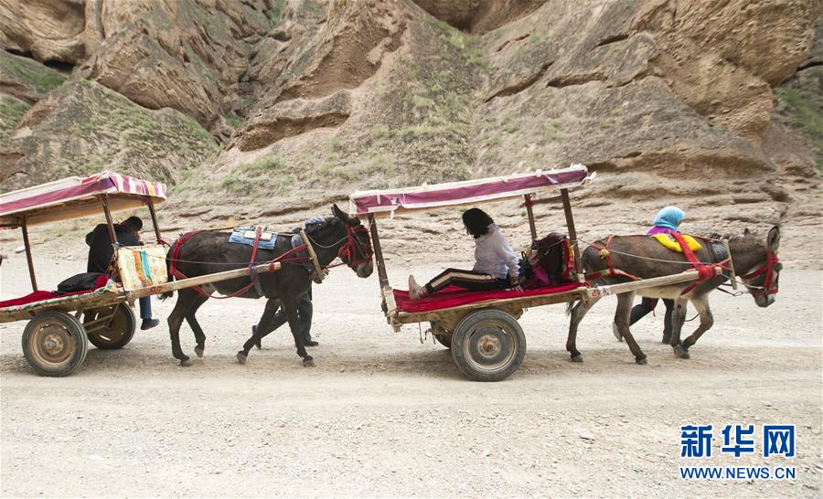 5月29日,游客坐“驴的”在黄河石林景区游玩。 68岁的尚可栋是甘肃省白银市景泰县中泉镇龙湾村村民,因为龙湾村毗邻著名的黄河石林景区,十多年来,通过给前来旅游的中外游客当“驴的”司机,尚可栋家的日子越过越红火。据他介绍,在旅游旺季,他每天能带4趟游客,收入可达300多元。 黄河石林风景区将黄河、石林、沙漠、戈壁、绿洲等多种自然资源巧妙组合在一起,山水相依,动静结合,气势磅礴。通过多年发展,已成为甘肃省地质遗迹自然保护区、国家4A级旅游景区,每年都会吸引大量中外游客前来观光旅游。 依靠得天独厚的旅游资,当地积极发展乡村旅游助推精准扶贫,村里不少村民通过赶“驴的”为游客服务,实现了旅游致富。据介绍,目前龙湾村共有“驴的”360辆, 2018年全村人均可支配收入达到13800元,其中旅游收入占比达到76%。 新华社记者 张帆 摄