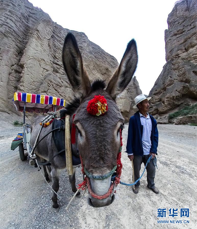 5月29日,尚可栋在黄河石林景区赶“驴的”。 68岁的尚可栋是甘肃省白银市景泰县中泉镇龙湾村村民,因为龙湾村毗邻著名的黄河石林景区,十多年来,通过给前来旅游的中外游客当“驴的”司机,尚可栋家的日子越过越红火。据他介绍,在旅游旺季,他每天能带4趟游客,收入可达300多元。 黄河石林风景区将黄河、石林、沙漠、戈壁、绿洲等多种自然资源巧妙组合在一起,山水相依,动静结合,气势磅礴。通过多年发展,已成为甘肃省地质遗迹自然保护区、国家4A级旅游景区,每年都会吸引大量中外游客前来观光旅游。 依靠得天独厚的旅游资,当地积极发展乡村旅游助推精准扶贫,村里不少村民通过赶“驴的”为游客服务,实现了旅游致富。据介绍,目前龙湾村共有“驴的”360辆, 2018年全村人均可支配收入达到13800元,其中旅游收入占比达到76%。 新华社记者 王益亮 摄