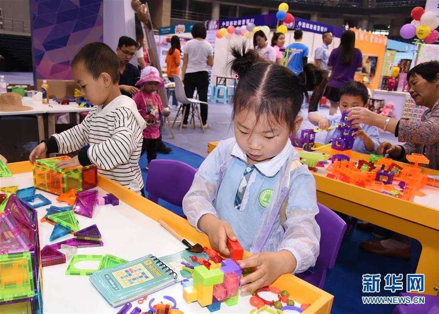 6月1日,小观众在展会上玩商家免费提供的智力玩具。 “六一”期间,2019青岛国际儿童产业博览会在山东青岛举行。展会上,商家纷纷使出浑身解数,通过赠品、游戏、促销等方式“讨好”家长、争夺小客户,童展经济竞争日趋激烈。 新华社记者 李紫恒 摄